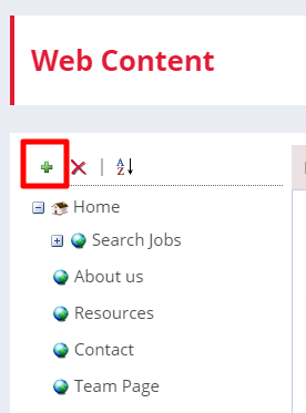To add a menu URL Link, first create a new web page by clicking the green + symbol, within Web Content.