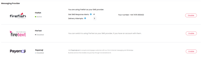 🗒️Note: only one SMS providers can be active at the same time - Firefish SMS or Firetext- this doesn't apply to Instant Messaging options