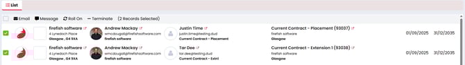 You can perform the same actions in either the List or Calendar View. Select one or more candidates to send messages, emails, roll on, or terminate contracts.