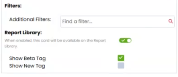 When you’re adding/editing a card in the Report Library you now have the option to flag it as BETA or NEW.