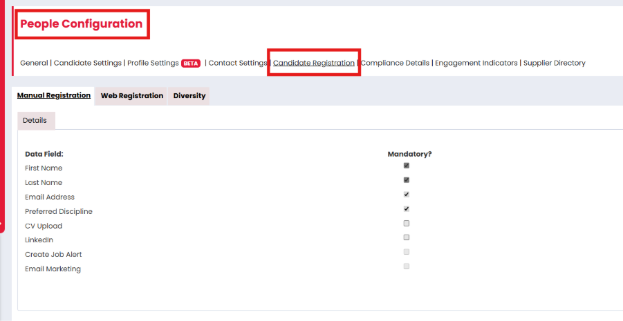 Candidate Registration: Website > Candidate Registration has been removed. The configuration pages for Manual Registration, Web Registration and Diversity can now be found under People Configuration > Candidate Registration