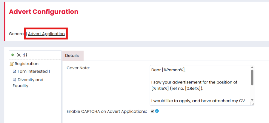 The Advert Application configuration can be found under Advert Configuration