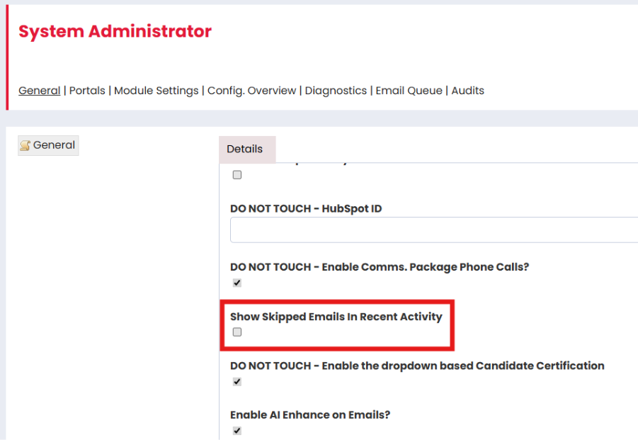 Skipped Emails: Skipped emails are now automatically hidden from the recent activity list for all customer user types. Please note that this is still an available option when logged in as Sysadmin and can be displayed for all users by selecting the module setting “Show Skipped Emails in Recent Activity” under System Administrator > General