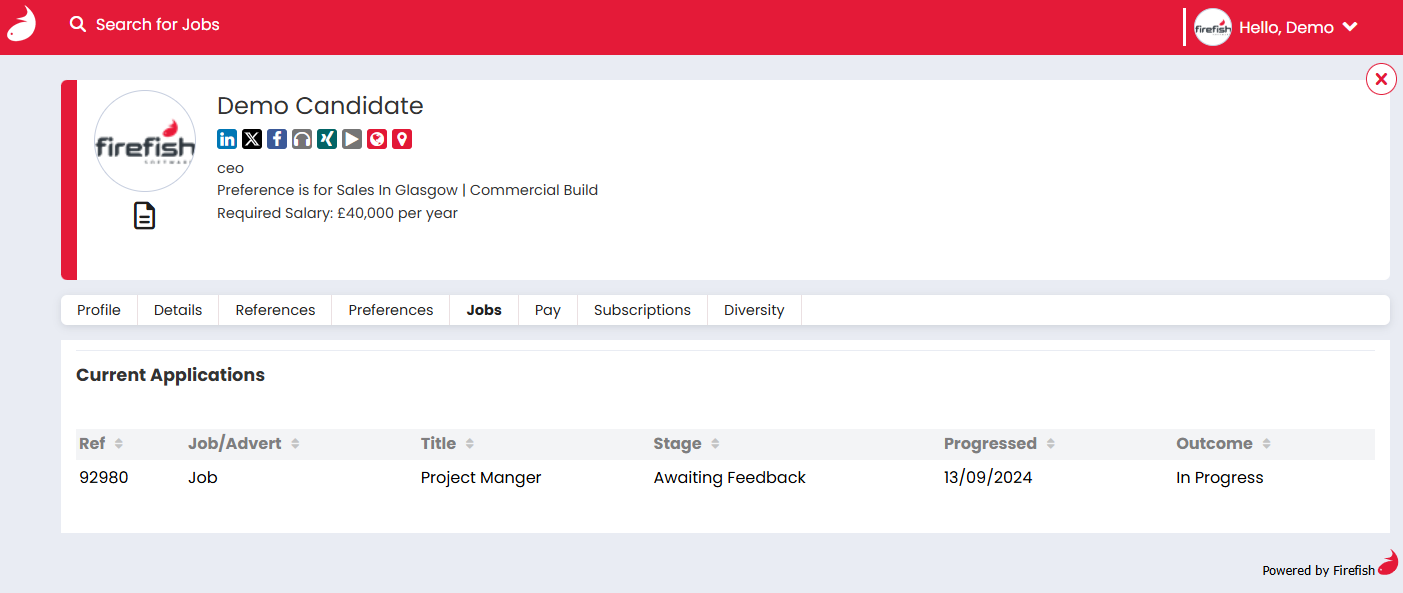 The Jobs section shows candidates a list of the jobs they have applied and been considered for by your users - this replicates the Recruitment tab in the Recruiter Portal.