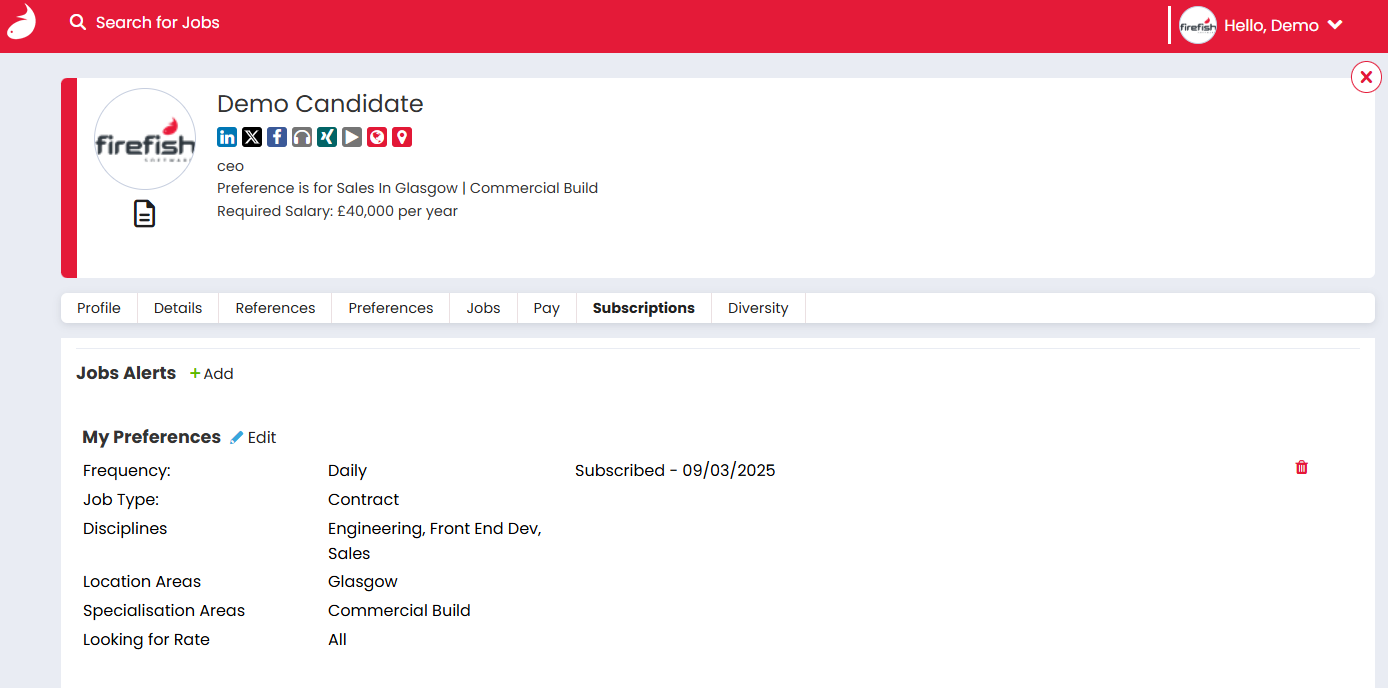 The Subscriptions screen allows candidates to select the Job Alerts they are subscribed to and also update their email and SMS marketing preferences.