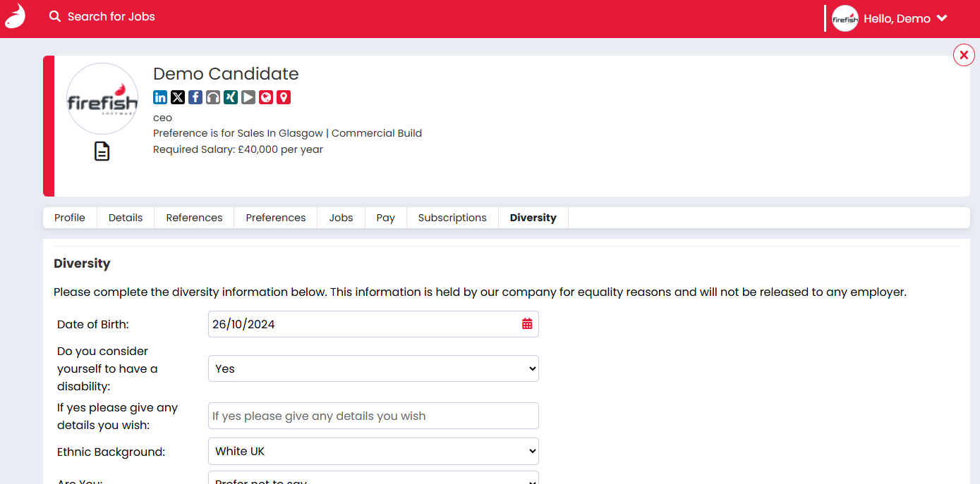 The Diversity tab will allow candidates to complete your Diversity Monitoring form.