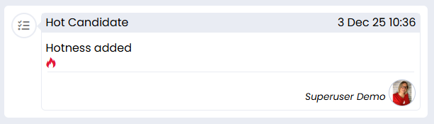 Adding hot status to a candidate record will also record an action in their Recent Activity, so we can see if candidates have previously been considered hot, who added/removed the status and when.