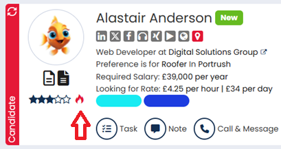 The hot flame allows you to mark a candidate as particularly stand out. This is a a temporary way to highlight that a candidate is one to be watched. Typically, you'd be wanting to work closely with these candidates to get them placed quickly. Hot candidates are those who are ready for placement or are highly engaged so should be on your team's radar.