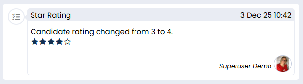 Amending the star rating on a candidate record will also record an action in the Recent Activity, so we can see if or when a candidates star rating has been changed.