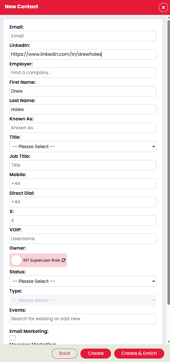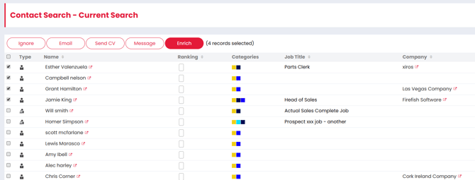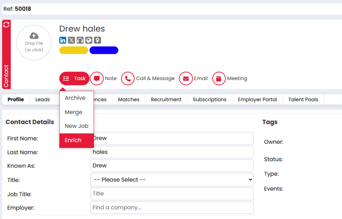The contact will show an Enriching status while Firefish Enrich searches for results. When complete, the status updates to Enriched and any verified or validated data found will populate the relevant fields.