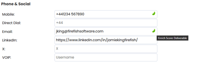 Firefish Enrich may find a deliverable or high probability email but not find a verified phone number. Check the phone confidence fish icons for Mobile and Direct Dial.