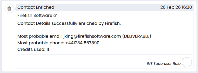 When enrichment completes, Firefish logs an action in the contact’s activity feed: