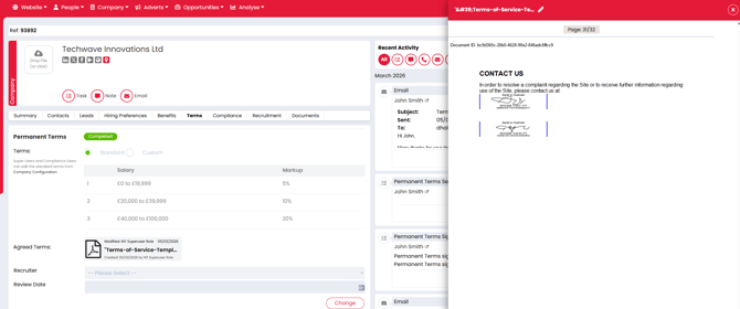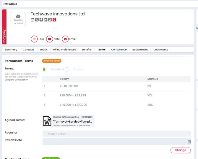 The eSign for Terms of Business feature allows you to automate the sending, signing and storage of your terms directly from Firefish. This helps you keep important agreements organised while reducing the time spent managing documents manually.