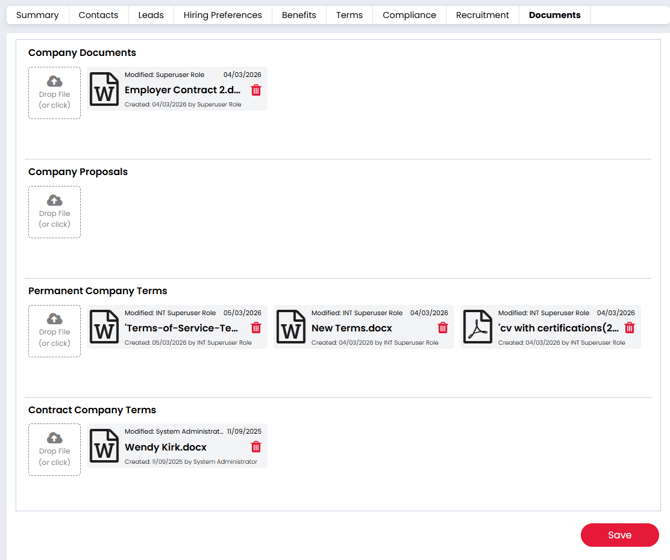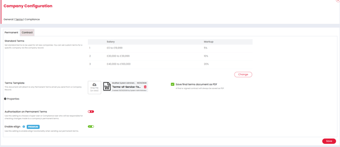 With eSign enabled, recipients can securely sign your Terms of Business electronically, countersigners can complete the document where required, and the final signed agreement is automatically stored against the company record.