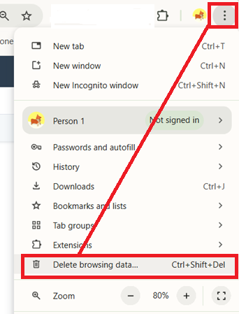 To clear the cache on Edge, select the three dots in the top right hand corner, then select 'Delete browsing data'.