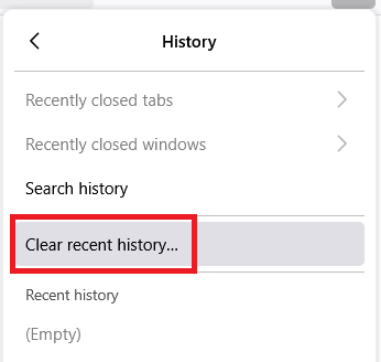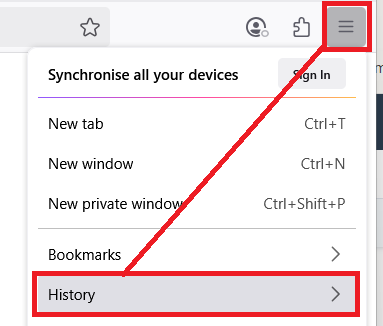 To clear the cache on Firefox select the three lines at the top right-hand side of the page and select 'History'.