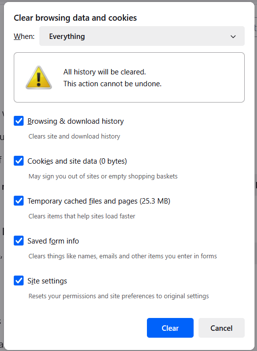 Once you have selected the relevant options and time range you can select 'Clear'.