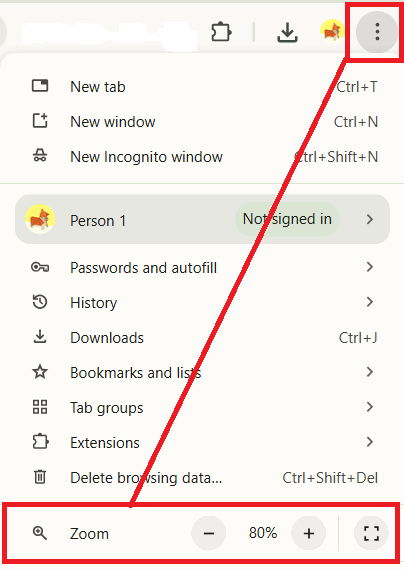 You can either continue to use the menus highlighted in the above image, or you can click the three dots in the top right hand corner of your browser and adjust the zoom. Most desktop computers can be on 100%, but laptops usually benefit for being set to 80%. The correct percentage will differ from person to person, as it will depend on your device's screen size and how comfortable it is for your eyes to read all the information on the page.