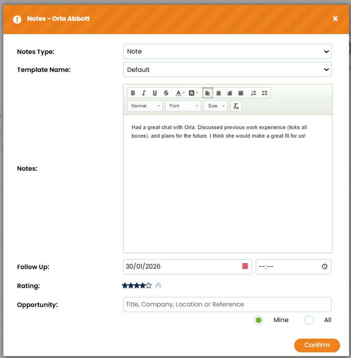 5. If you wish, you can also add a follow-up date, adjust the candidate's star rating and link the note to a particular opportunity