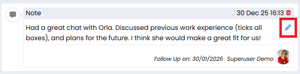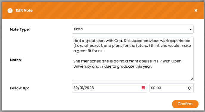 3. The note will open and you will be able to amend the content, change the note type and set a different follow-up date.