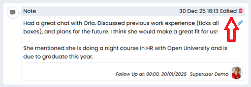 When you edit a note, the old note will not be logged in the recent activity. The updated version of the note will be marked with an 'Edited' tag to confirm changes were made to the note.
