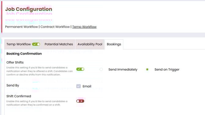 In the Bookings tab, you'll see a Shift Offered setting. When this setting is disabled, candidates continue to follow the existing workflow and no Shift Offered notification is sent when they are assigned to a shift.