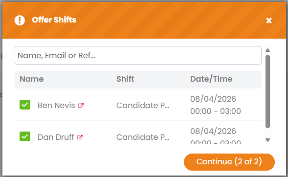 • A modal opens showing the candidates and shifts that are about to be offered. At this point any candidates you do not wish to be offered shifts can be deselected and they'll stay at 'Pending' :