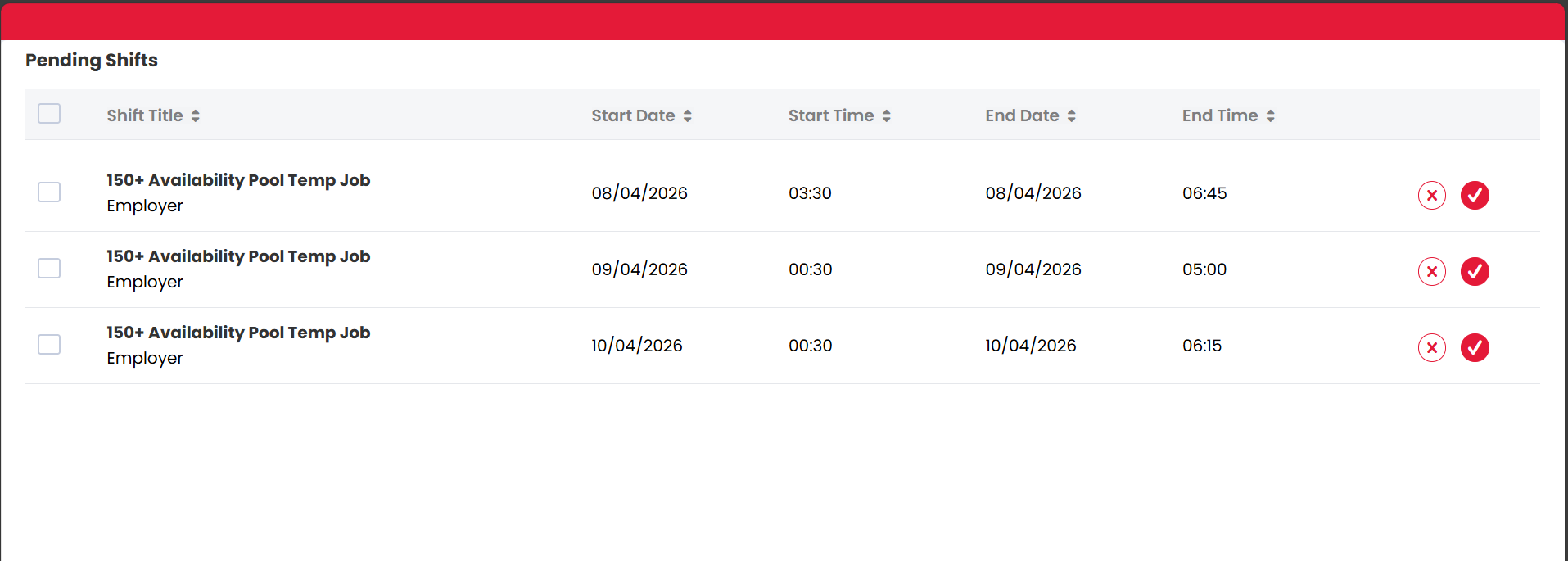 Candidates receive a Shift Offered email with a secure link to review their shifts. From there, they can accept or decline shifts individually or in bulk.