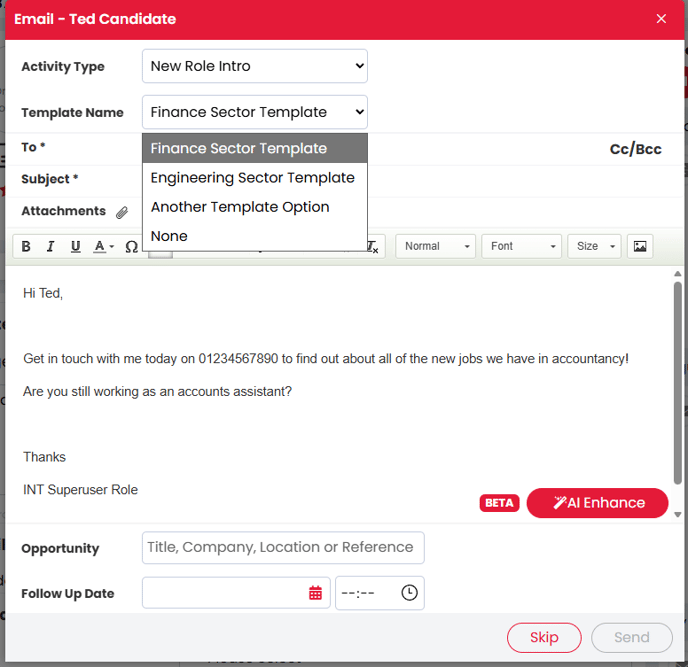 When logging calls or messages, recruiters can now choose from your customised list of activity types and templates— ensuring consistent communication logs across the business.