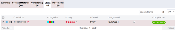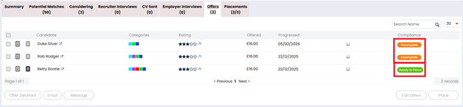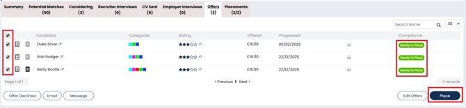 To place a candidate, you should first of all ensure that they're in the Offer stage. You should also make sure they are showing as 'Ready to Place' in the compliance column.