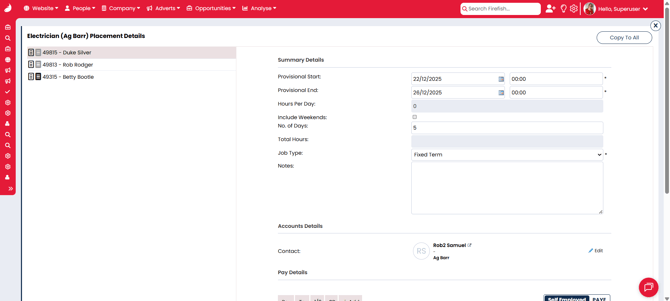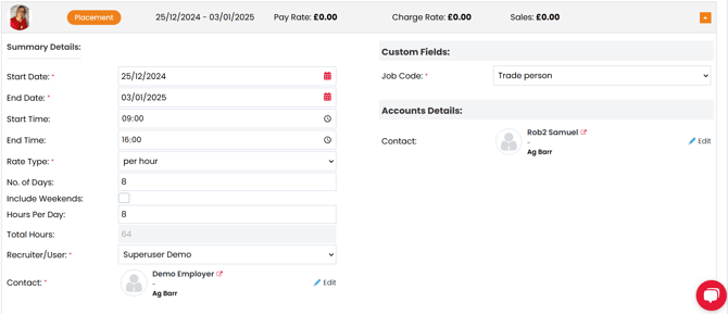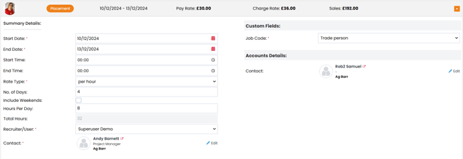 Once a candidate has been placed in either a contract or a permanent job, you can edit their placement details any time through the Placements tab on the job workflow: