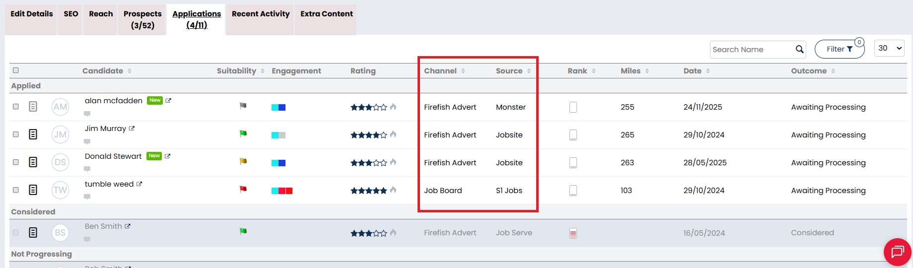 This information can then be pulled onto a report allowing you to review what is working best for your business. This report can be found by going to Analyse > Standard Reports > Adverts > Candidate Source Per Advert. This report shows what source that candidate came from and the number of applications that were considered or not progressed.