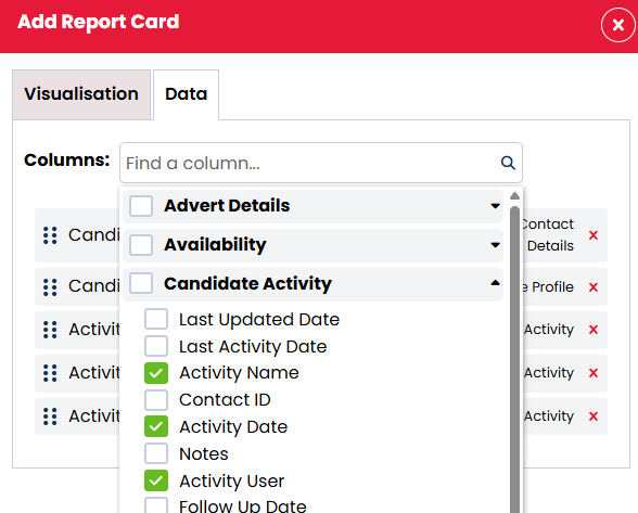 Module: You need to select a module when creating your report card. This module contains the type of information you want display. You can choose from these options: Candidate, Contact, Company, Job, Advert & Lead