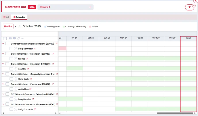 In the Calendar, each placement is colour-coded to show whether it’s pending start, currently contracting, or ended, and you can switch between Day, Week, Work Week, and Month modes depending on the level of detail you need.