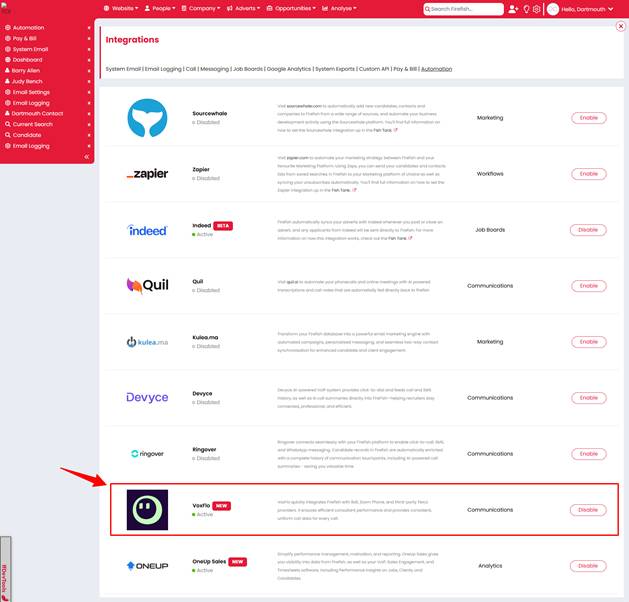 VoxFlo integration has been added to the “Automation” settings page. The integration will generate a Client ID and Secret for our customers to connect Firefish to their VoxFlo profile.