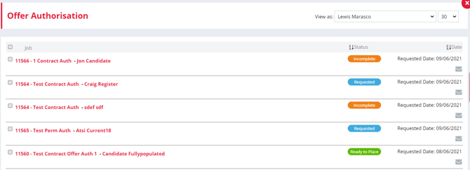 The status of the offer authorisation will also show on the job record under the Offers tab.