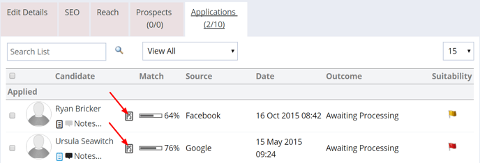 You can review candidate responses to Pre-Screen questions by selecting the PS document icon in the Applications tab. If a candidate fails a Yes/No question marked for auto-rejection, they will automatically receive a "Not Progressed" email 24 hours after applying, with the reason noted in their action history.