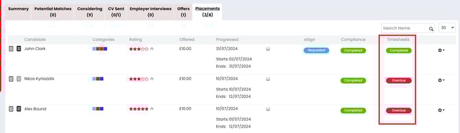 In the Time Capture column you can easily see the current status of the timesheets for each candidate placed against the contract job. The Time Capture statuses are: