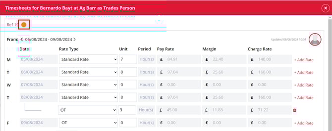 The coloured dot in the top left hand corner of the timesheet indicates if the timesheet for the week being viewed is overdue (red), incomplete (orange) or complete (green).