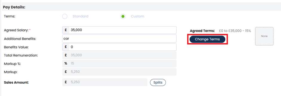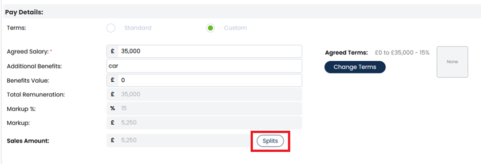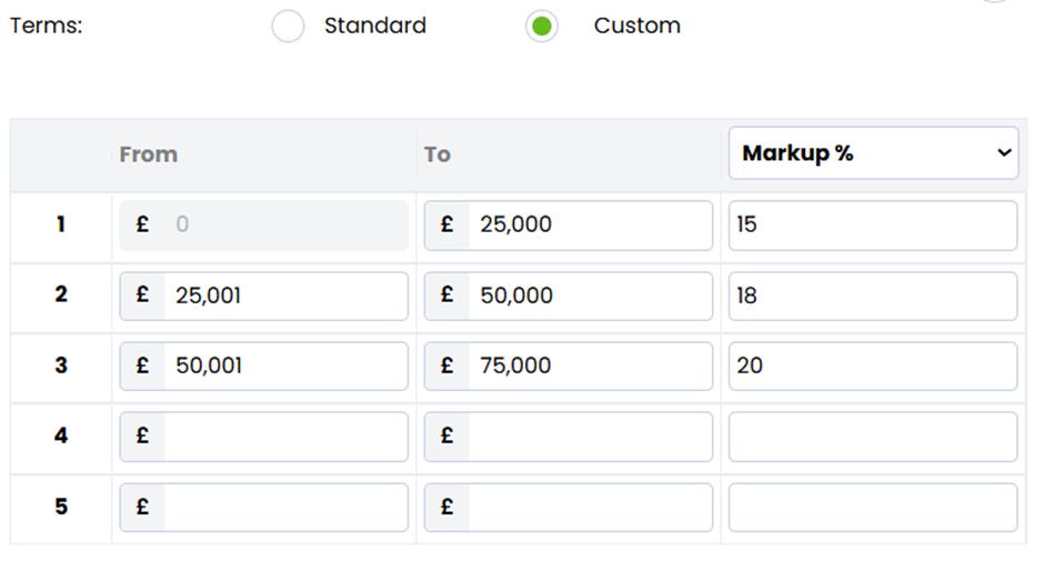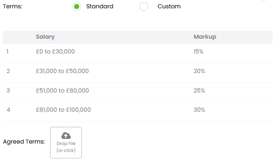 You might instead see that the terms are set to custom - or you might with to make them custom. Here you can dictate your own bandings, and the relevant fee percentage. When using custom banding, ensure that your salary is included.
