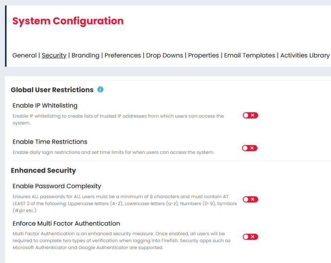 Firefish gives you the option for additional security when accessing the system by enabling multi-factor authentication, IP whitelisting, time restrictions and password complexity. These security settings can be applied on both global and individual levels.