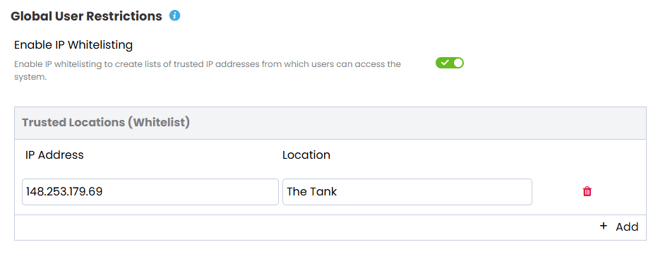 IP Whitelisting allows you to mark certain IP addresses as safe, meaning that your users can only log on from these IP addresses. For example, you might only want users to login whilst they're in the office.