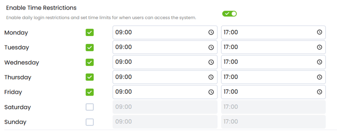 If you only want your team to be able to login during certain hours or on certain days of the week then: