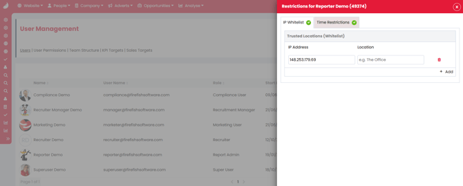 Super Users can apply IP Whitelisting and Time Restrictions to individual users: