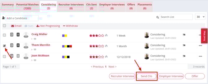 You can send candidate CVs to hiring managers through Firefish by using the Send CVs button shown at the bottom of either the Considering or Recruiter Interviews stages.