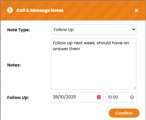 All actions are tracked against the Contact, keeping your pipeline fully transparent. Add a Follow-Up Date to set reminders and stay on top of outreach.
