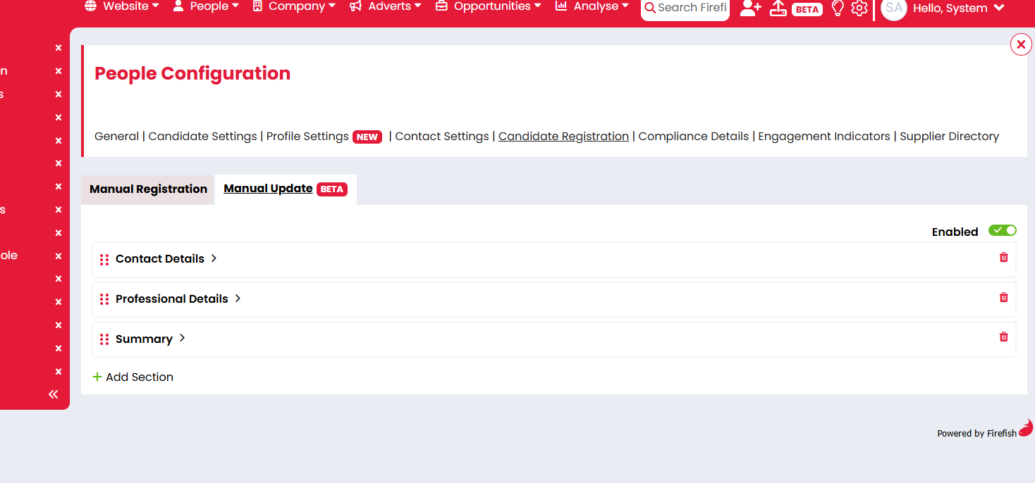 The available fields are based on the candidate fields already supported in your Firefish setup. The fields you add here are separate from your Manual Registration form, so changing the Manual Update form will not change your registration form.