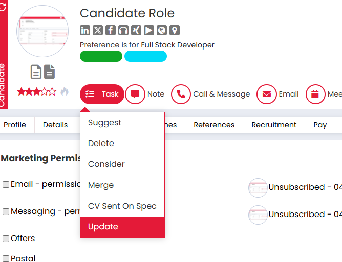 Once fields have been added, the Update option will appear in the Tasks dropdown on the main candidate profile.
